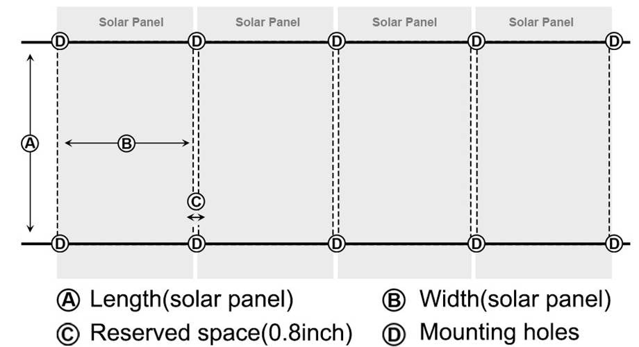 2. Mark five vertical lines that intersect with the two lines(from step A), the distance between each two is the solar panel width plus another 0.78inch(20mm).